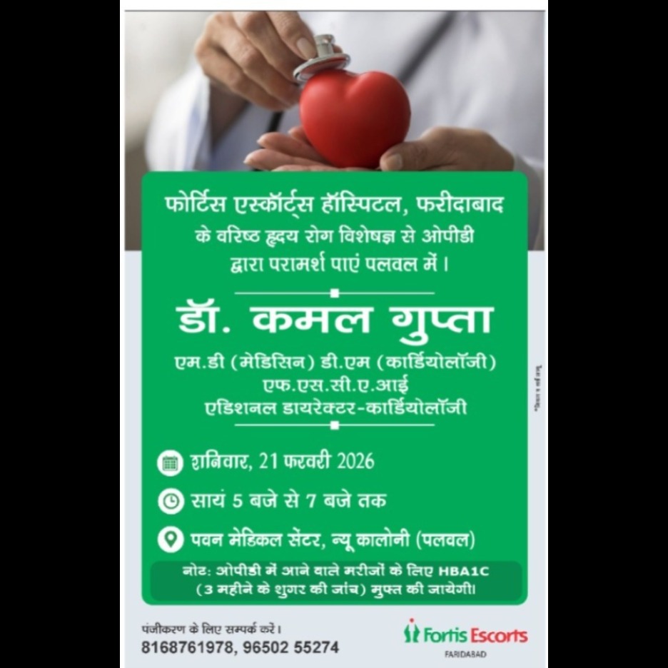 Fortis Escorts Hospital Faridabad Health Check-Up Camp. We are organizing an OPD consultation with Dr. Kamal Gupta (Principal Consultant - Cardiology) . Date: Saturday, 21st February 2026. Time: 5:00 PM to 7:00 PM. Location: Pawan Medical Center, New Colony, Palwal. Tests Available: Blood Pressure (BP) Blood Sugar ECG HbA1c Lipid Profile.