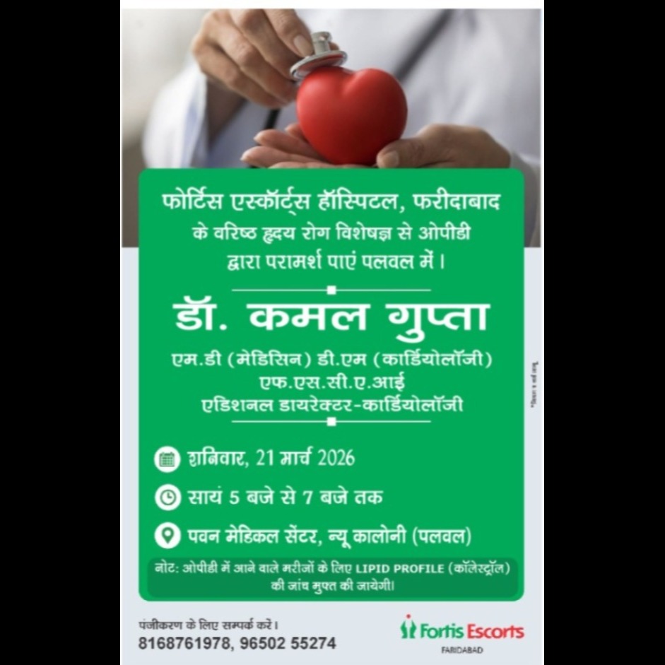 Fortis Escorts Hospital Faridabad Health Check-Up Camp. We are organizing an OPD consultation with Dr. Kamal Gupta (Principal Consultant - Cardiology) . Date: Saturday, 21st March 2026. Time: 5:00 PM to 7:00 PM. Location: Pawan Medical Center, New Colony, Palwal. Tests Available: Blood Pressure (BP) Blood Sugar ECG HbA1c Lipid Profile.